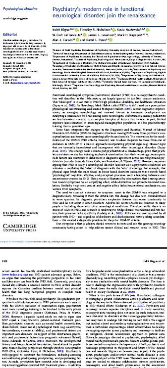 “Recent diagnostic improvements, an emerging neurobiology and renewed interest in treatment development are catalyzing a renaissance for FND among some neurologists. Unfortunately, many psychiatrists are less interested – related to a complex interplay of factors that include, in part, limited exposure (and education) in assessing and managing this population, and less psychotherapy training than a generation ago. (…)