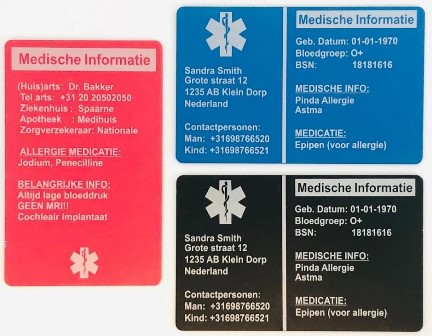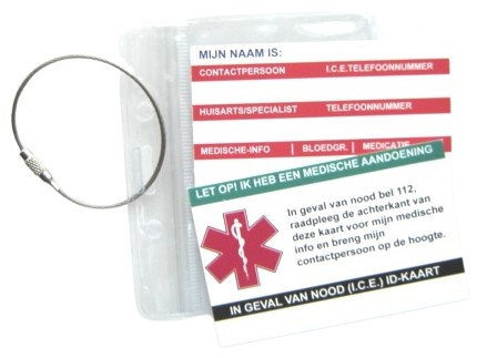Dit is een stevig, plastic pasje met daarop aan 1 zijde jouw nood-informatie.