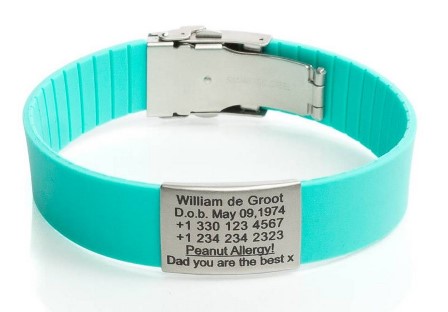 Deze versie van de armband kan op de voor- én achterkant gegraveerd worden maar dan moet de armband afgedaan worden door de mensen die je willen helpen.