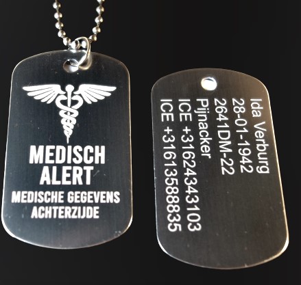Daaronder een opvallende medische tag. Aan de ene zijde een rood-witte tekst met medical alert, daaronder kun jij zelf FNS laten invullen. Op de andere kant 6 regels tekst.