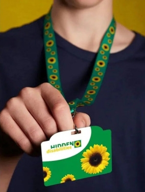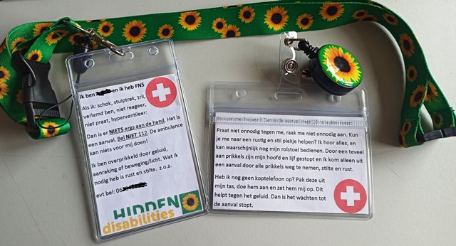 Speciaal voor ‘verborgen stoornissen’ is er het zonnebloem-ontwerp. Dit wordt al heel veel gebruikt, ook internationaal, en op veel plekken wordt het ontwerp herkent. Het betekent dat je een handicap of stoornis hebt die je niet snel herkent, zoals autisme. Of zoals FNS wanneer je snel overprikkelt raakt, problemen hebt met spraak etc. Dus nog voor ze de kaart lezen weten mensen al dat er iets is.