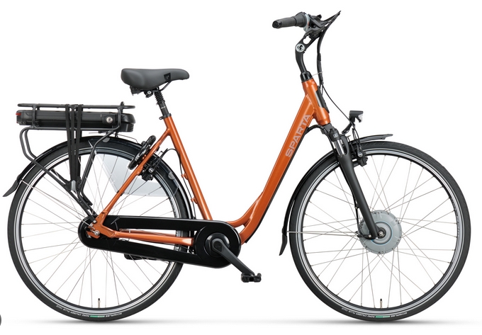 De andere soort elektrische fiets heeft een voorwielmotor. Hier zit de motor in het voorwiel. Deze geeft altijd extra kracht, ongeacht hoeveel kracht jij geeft. Zodra jij de trappers beweegt, hoe langzaam ook, gaat de motor aan en kom je in beweging. Om met de optelsom weer te vergelijken: als je de fiets in stand 1 zet, geeft hij 1x kracht zolang je de trappers maar beweegt. Hoe hard of zacht jij trapt maakt niet uit. Als de je fiets in stand 5 zet geeft hij 5x kracht, zolang je de trappers maar beweegt.
