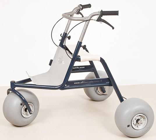 | outdoor rollator Wie graag echt erop uit gaat of een sportieve rollator wil puur vanwege de uitstraling kan een outdoor of offroad rollator kopen. Die zijn helemaal gemaakt om bos of grasgebied te trotseren. Er zijn zelfs strand-rollators met heel brede wielen (rechter rollator hiernaast). De prijzen liggen wel flink hoger. De linker rolstoel hiernaast kost meer dan 1.000 euro nieuw. | ![]() |