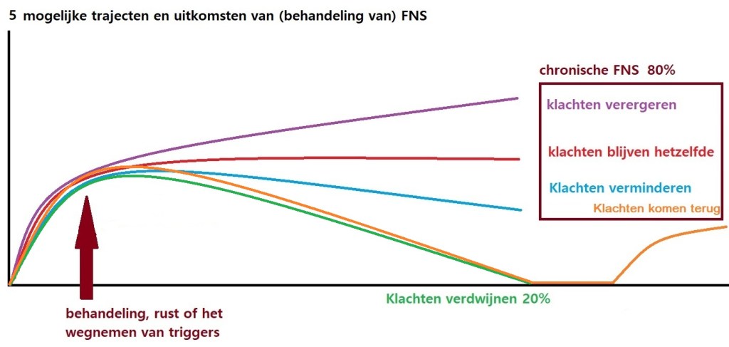 Als je na behandeling niet geneest kan het wél zo zijn dat je klachten minder worden. Maar soms helpt behandeling niet. Wanneer je na behandeling nog klachten houdt (een beetje of heel veel) heb je langdurige of chronische FNS. Hoe lang langdurig precies is kan niemand je vertellen. Omdat er niets kapot is in je hersenen is genezing in principe altijd mogelijk. Ook na 5 jaar kan er plots verbetering optreden of je kunt zelfs genezen. Maar anderen hebben na 30 jaar nog steeds FNS. Niemand weet waarom sommige mensen genezen en anderen de rest van hun leven klachten houden.