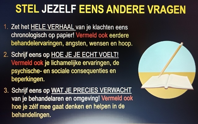 Hierdoor is de patiënt zelf de grootste expert. En met die gedachte, wil Oerlemans FNS-patiënten het advies geven om jezelf eens andere vragen te stellen dan het standaard hoe en het waarom.