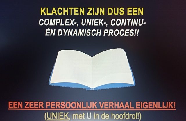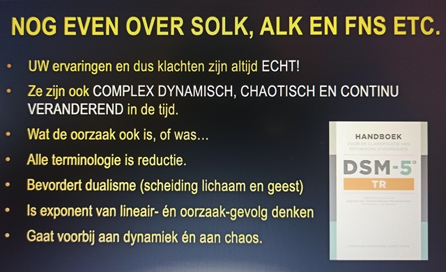 De lezing van Oerlemans werd geïntroduceerd als ‘wat doen namen als SOLK, ALK, conversiestoornis er nou toe?’ Op het laatst kwam dat toch aan bod. Want met de uitleg over het mens als complex systeem en FNS als een verstoring van dit systeem, kom je uit bij de naam. Want hoe noem je dit? Nu heet het FNS. Soms wordt het gezien als SOLK (somatische onverklaarde lichamelijke klachten) of ALK (aanhoudende lichamelijke klachten). Maar Oerlemans stelt dat elke naam eigenlijk de aandoening tekort doet. Met een naam stop je iets in een hokje waardoor je weer kijkt naar stukjes, niet naar het geheel. Een enkele naam gaat voorbij aan de dynamiek en aan de chaos.