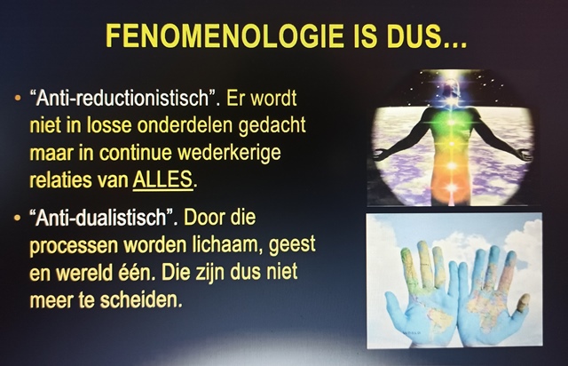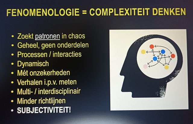 Oerlemans kwam uit bij een stroming in de filosofie: de fenomenologie (ja, dat woord is een mond vol vonden we op de redactie). In de fenomenologie kijken ze niet alleen naar de feiten, maar naar de gehele ervaring. Dus niet alleen het gebroken been en het gips, maar ook naar wat de pijn doet (huilend in bed), wat de consequentie is (de hond kan niet worden uitgelaten), enzovoort. De gehele ervaring telt, en niet alleen de feiten van het been.