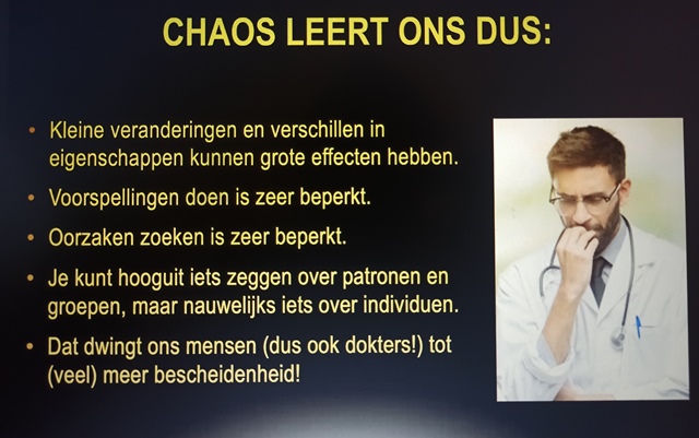 Als je beter leert kijken naar die chaos, naar de ontregeling van het gehele systeem, kun je als arts leren. Je leert dat je maar beperkt naar oorzaken kunt zoeken. En dat je maar beperkt voorspellingen kunt doen. Daardoor leer je meer bescheiden kijken naar wat je zelf weet.