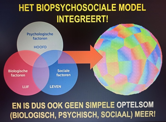 Als je kijkt vanuit de mens als een systeem dat continu in beweging is en continu reageert, moet je anders naar het bio-psycho-sociaal model kijken. Dat is dus niet een eenvoudige optelsom van 3 stukjes, maar het is een bewegend en reagerend onderdeel van een groter geheel.