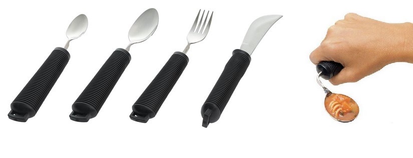 Ik gebruik van dat stevige, ‘chunky’ maar lichtgewicht bestek dat ik makkelijk vast kan houden. En hele diepe pastaborden zodat je veel minder moeite hebt met het op je lepel krijgen. En ik gebruik heel vaak de lepel, dat is echt veel makkelijker eten dan een vork.