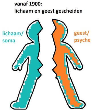 Tot in 1900 artsen een verschil gaan maken. Freud is hier één van de grondleggers van. Zij maken een verschil tussen het lichaam (soma) en de geest (psyche) en ‘scheuren’ ons eigenlijk doormidden. Hierdoor worden ziektes opeens iets lichamelijks (somatisch) of geestelijks (psychisch). De psychiatrie is geboren. Dit is iets goeds, want er werd nu meer aandacht gegeven aan psychische problemen. Het probleem is dat de scheiding definitief was: psychiaters deden niets meer met het lichaam, en ‘gewone’ dokters deden niets meer met de geest. Ziektes en stoornissen moesten dan ook één van de twee zijn, beide kon niet. En dát was een probleem.