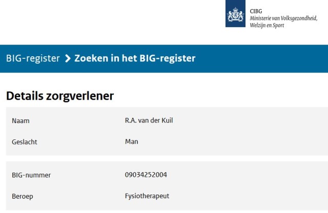 Ook pleegde hij valsheid in geschrifte door een BIG-nummer (een Nederlands registratienummer voor zorgmedewerkers waardoor je weet wie er echt zijn en wie niet) te geven dat niet klopt. Ooit was hij ingeschreven bij de BIG als fysiotherapeut. Hij is uit het register gezet, maar bleef onterecht zeggen dat hij dus wel geregistreerd stond. Na jaren vechten heeft hij zich onlangs weer opnieuw mogen inschrijven … Hij staat in 2024 inderdaad ingeschreven als fysiotherapeut. Niet neuroloog. Als fysiotherapeut.