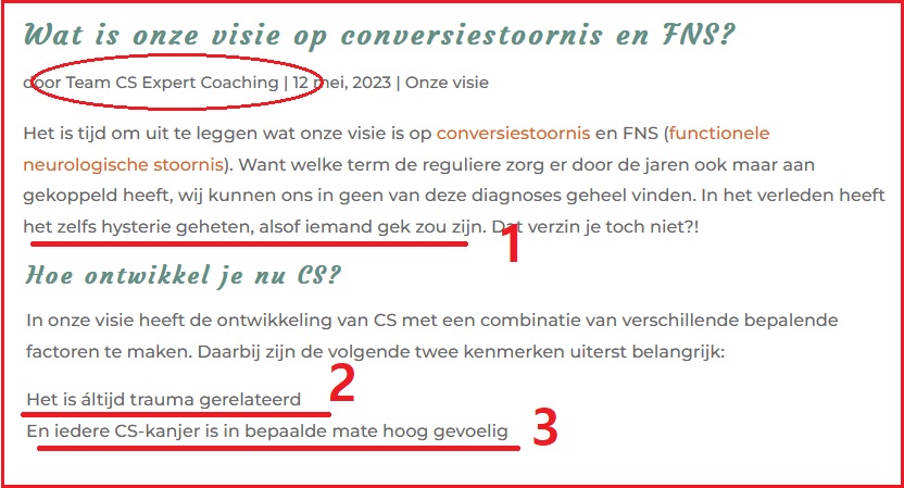 Bij 2 laten ze zien waarom hun website vol staat met het woord conversiestoornis. Ze geloven er nog in! De helft van de patiënten heeft geen achterliggend trauma maar zij weigeren dit te geloven. 20 jaar aan medisch onderzoek negeren ze. Ook hiermee geven ze aan FNS en de patiënt niet serieus te nemen.