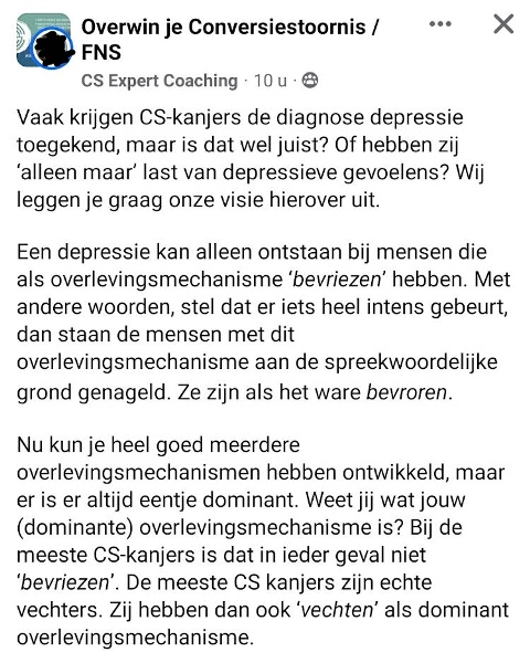 In dit kleine tekstje laten ze 7x zien geen enkele medische kennis te hebben en niets te weten van de nieuwe inzichten zijn rond FNS. Ten eerste zeggen ze dat een depressie alleen kan ontstaan bij mensen die als overlevingsstrategie ‘bevriezen’ hebben. Dat is complete onzin. Iedereen kan depressief worden, of je nu vooral vecht, vlucht of bevriest. Dit staat compleet los van elkaar, alsof je zegt dat alleen blonde mensen depressief kunnen worden. Ook zijn depressie en ‘aan de grond genageld staan’ twee compleet verschillende dingen en hebben deze helemaal niets met elkaar te maken. Ze weten helemaal niets van depressies maar verkondigen wel deze onzin.