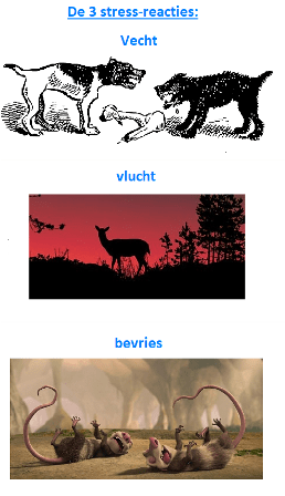 Elk dier heeft in principe 3 standaard stress-reacties als het in gevaar is: vechten, vluchten of bevriezen (verstijven). De vecht-vlucht-bevries reactie op stress kan op allerlei momenten opspelen, wanneer je in gevaar bent of schrikt. De reactie stopt zodra je niet meer in gevaar bent.